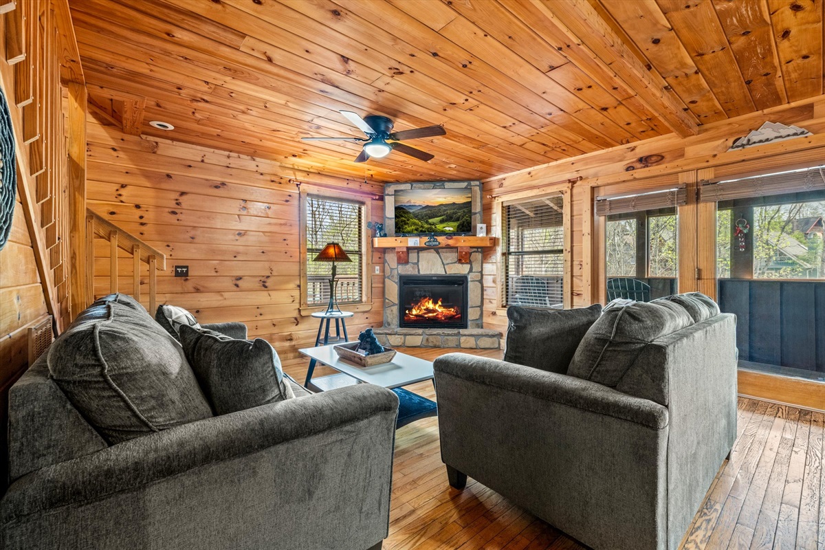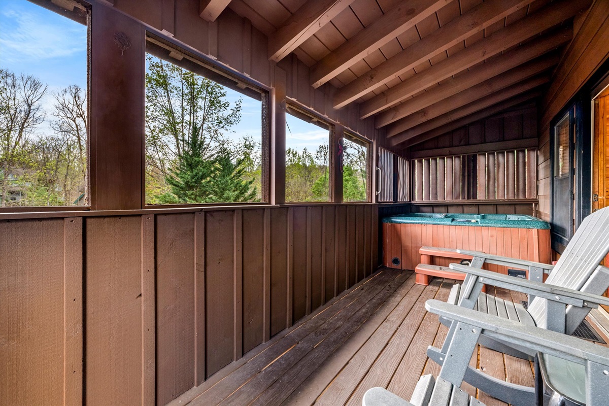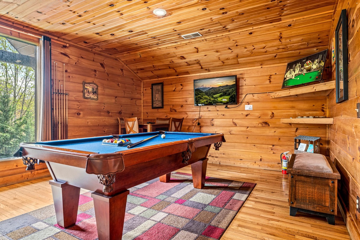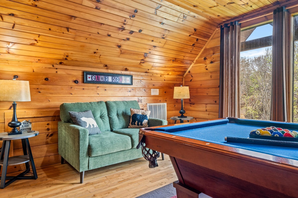 You'll enjoy the brand new 55" Roku TV in the living room while lounging on the comfortable couches. There's plenty of dining space at the table and countertops and the kitchen is stocked with dishes and cups for days! Both bathrooms have a jacuzzi tub for your enjoyment in private if you're not up for soaking in the hot tub under the whimsical string lights. The screened porch allows you to enjoy the outdoors whether it's sunny, rainy, or snowy! There is a natural gas grill available for whipping up delicious meals. There is a full sized pool table upstairs with lots of other board games! There are 2 king beds, 1 full/queen sleeper sofa, and 1 full/queen futon.